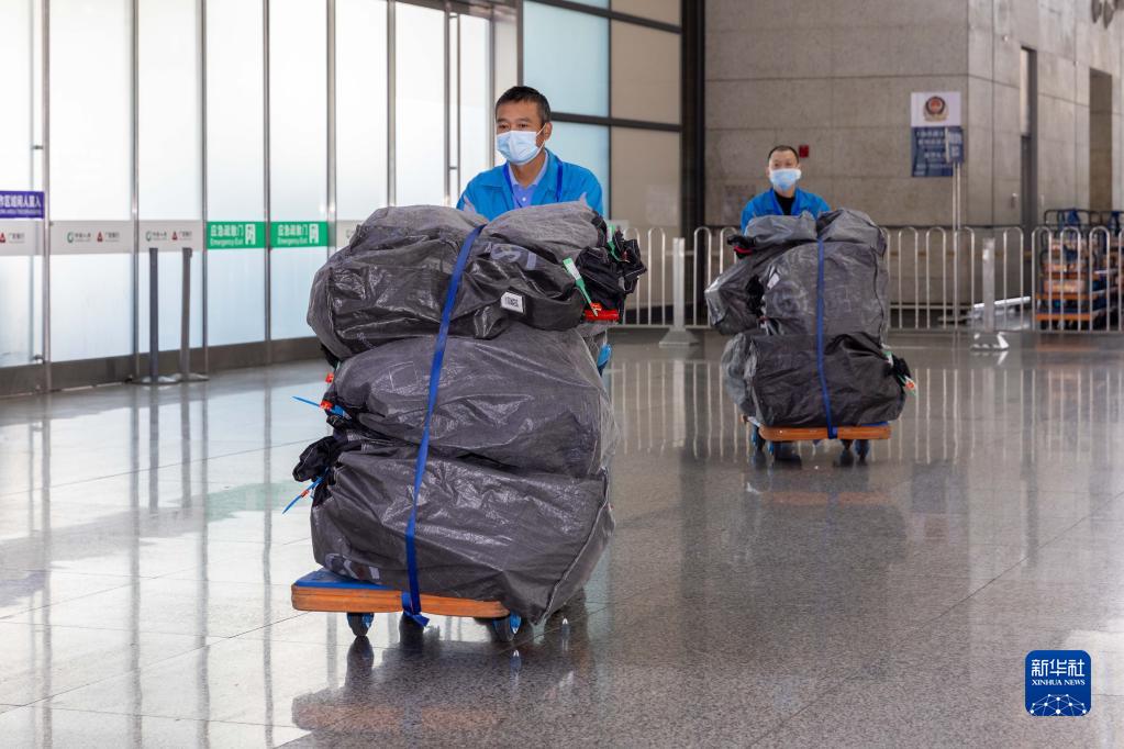 11月1日,在上海虹桥站,铁路工作人员运送通过安检的货物。