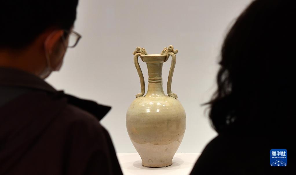 1月19日,观众在观看“白釉龙耳盘口瓶”。