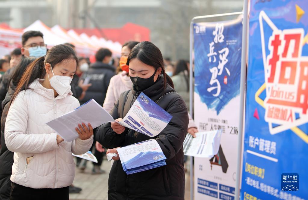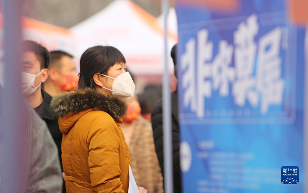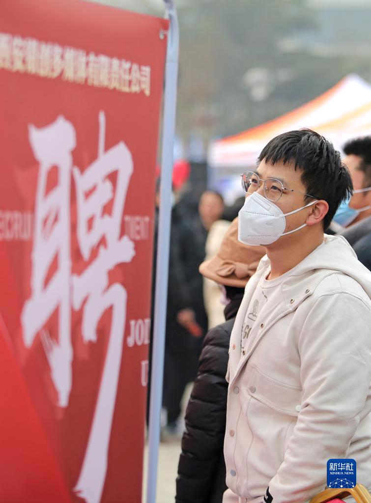 2月7日,求职者在陕西省渭南市临渭区中心广场招聘会现场寻找心仪岗位。