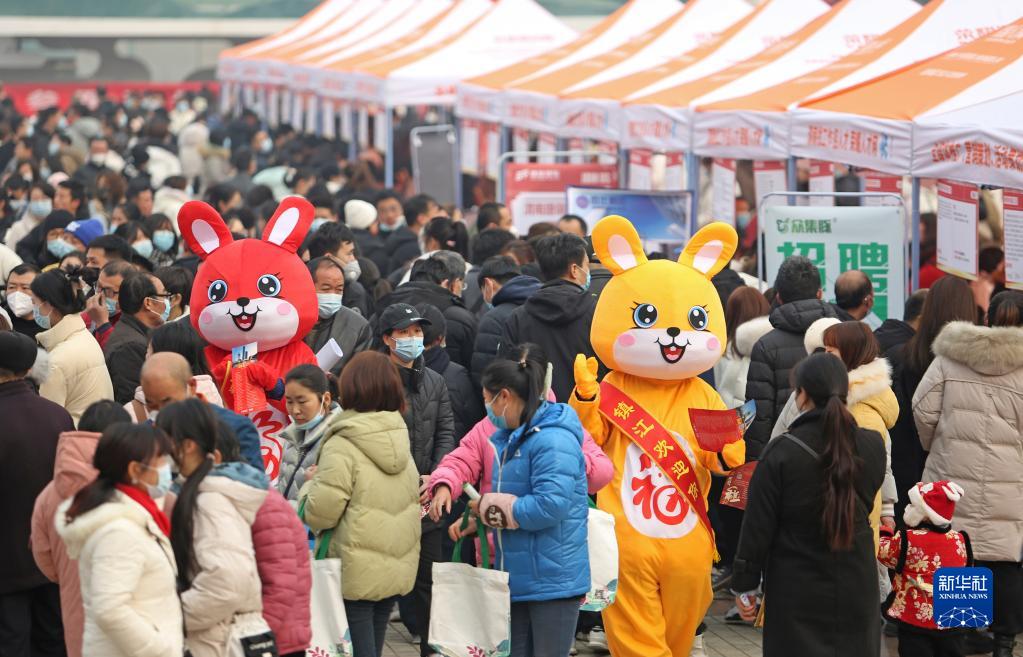 2月7日,陕西省渭南市临渭区中心广场招聘会现场,身着兔子服饰的工作人员在人群中发放招聘信息。