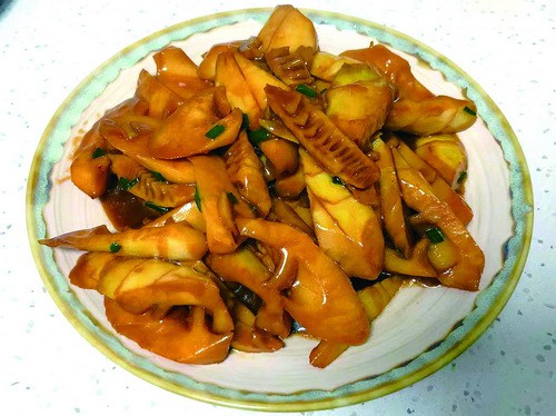 做法:剥去春笋的笋衣后焯水,将焯过水的笋切成滚刀块。锅底倒油,翻炒。加入适量生抽和少许盐,同时加少许老抽上色。翻炒后加入2勺白糖与少许料酒。然后在锅中加入一些水,小火盖焖8分钟。收汁后撒上葱花,即可出锅装盘。