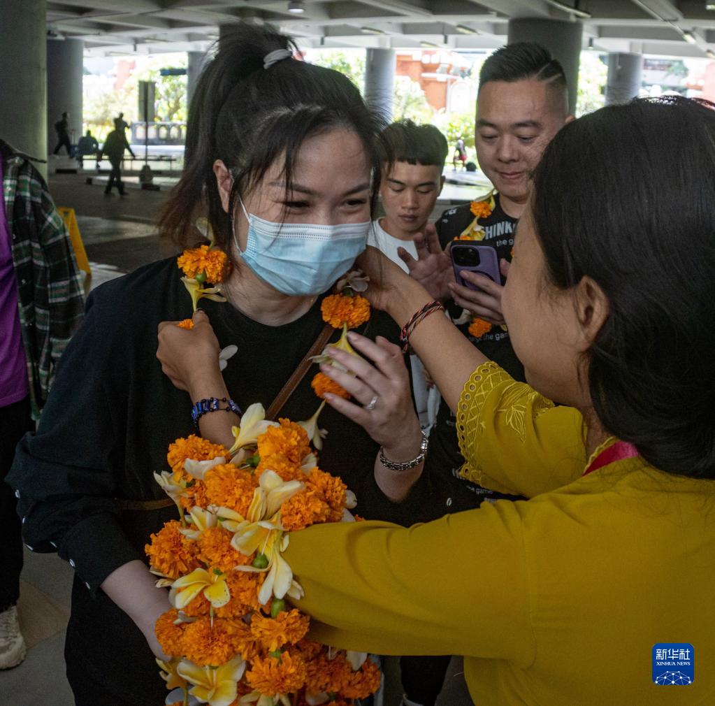 2月12日,在印度尼西亚巴厘岛伍拉莱国际机场,工作人员为中国游客佩戴欢迎花环。