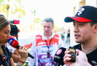 2月23日,2023赛季世界一级方程式锦标赛季前测试在巴林萨基尔赛道举行,周冠宇(右)接受采访。新华社发(钱俊摄)
