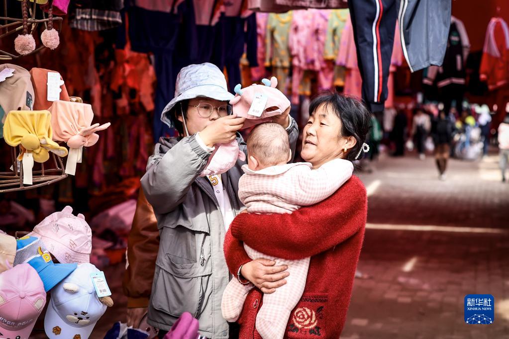 2月26日,在托克扎克镇农贸市场,一名女士在给孩子挑选帽子。