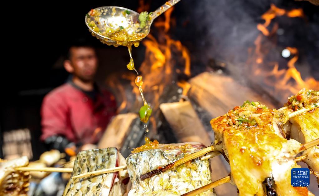 2月26日,在托克扎克镇农贸市场的一处摊位前,摊主给炙烤的鱼块淋上料汁。