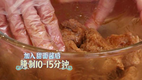 排骨沥水后,用老北京甜面酱腌制10-15分钟。