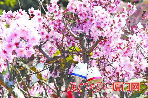 日前,记者来到台林农场,只见满山坡都是绽放的樱花,引来众多游客赏花踏青,感受大好春光。一簇簇粉色樱花,随风飘落,引人遐思。拾级而上,山顶的一株樱花树特别醒目,它比山下的樱花树更老。林文献说:“这是一株母株樱花,25年前从台湾阿里山那边引种过来,山下种的多属于它的‘子孙’。”原来,林文献当年带来十余种台湾的樱花树苗,其中就有两株台湾阿里山的樱花树苗。林文献父子每年都用母株樱花进行嫁接,如今,台林农场的樱花树多达数百株。每年春季,漳州开发区台林农场樱花树如期盛开,吸引一批又一批游客前往观赏。