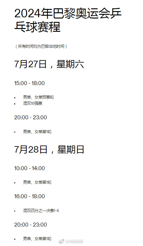 据@奥林匹克运动会 ,2024年巴黎奥运会的乒乓球比赛将于2024年7月27日至8月10日在南巴黎竞技场4号馆进行。以下为完整赛程(时间均为巴黎当地时间)。