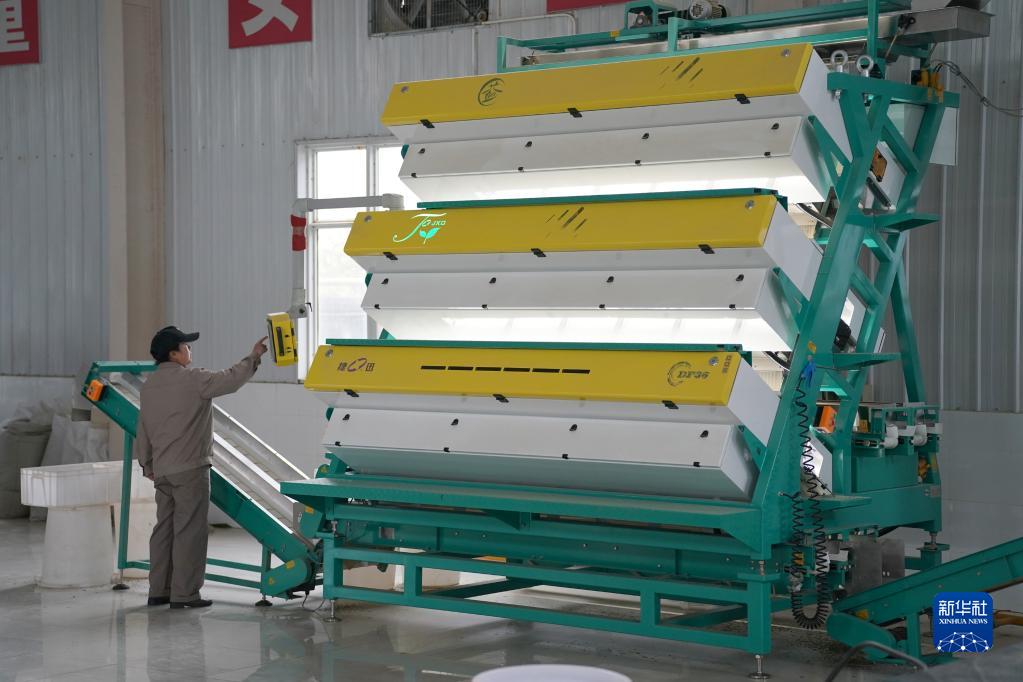 4月3日,在西乡县一家茶企生产车间,工人在操作色选机分拣茶叶。
