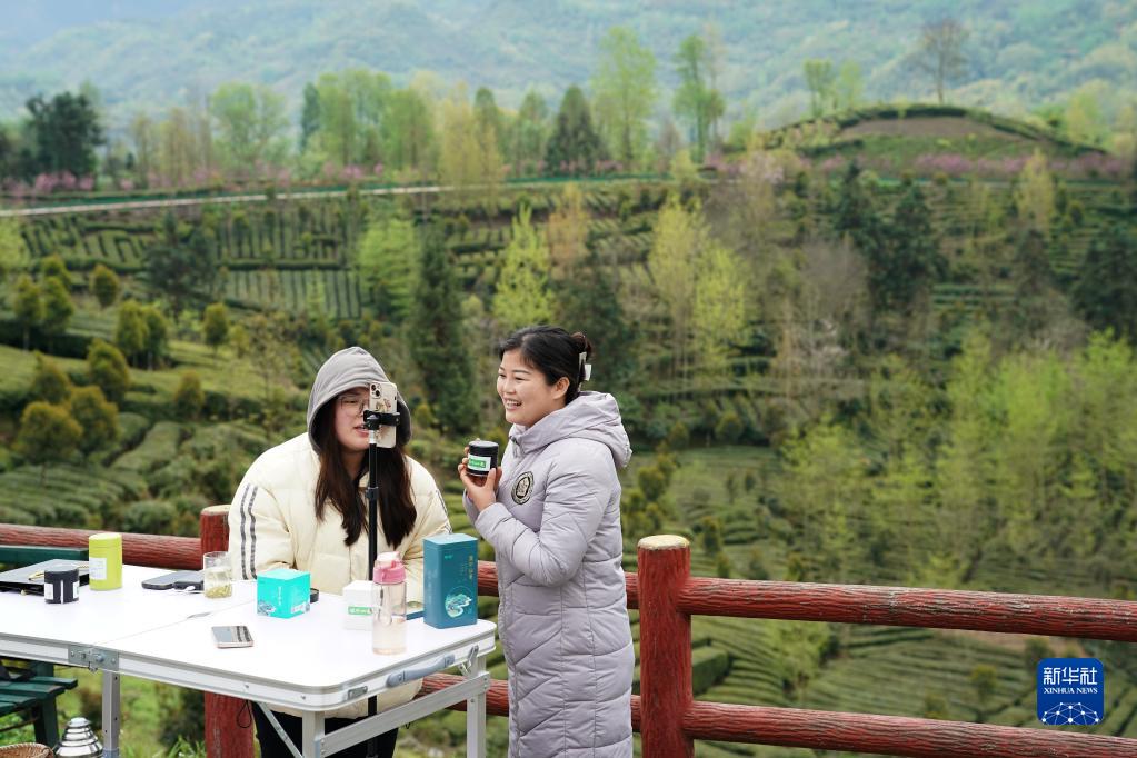 4月4日,电商主播在西乡县峡口镇茶园内直播销售茶叶。