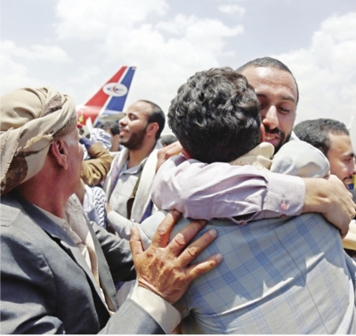 4月14日,在也门萨那机场,获释胡塞武装成员战俘下飞机后与家人拥抱。