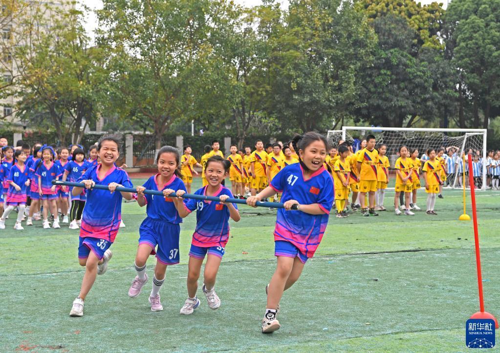 4月17日,孩子们在广西南宁市滨湖路小学进行民族体育比赛。