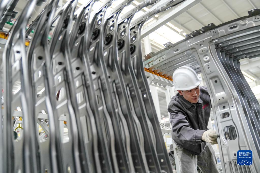 5月4日,在浙江省湖州市长兴经济技术开发区一家汽车部件有限公司,工人生产新能源汽车T型梁。