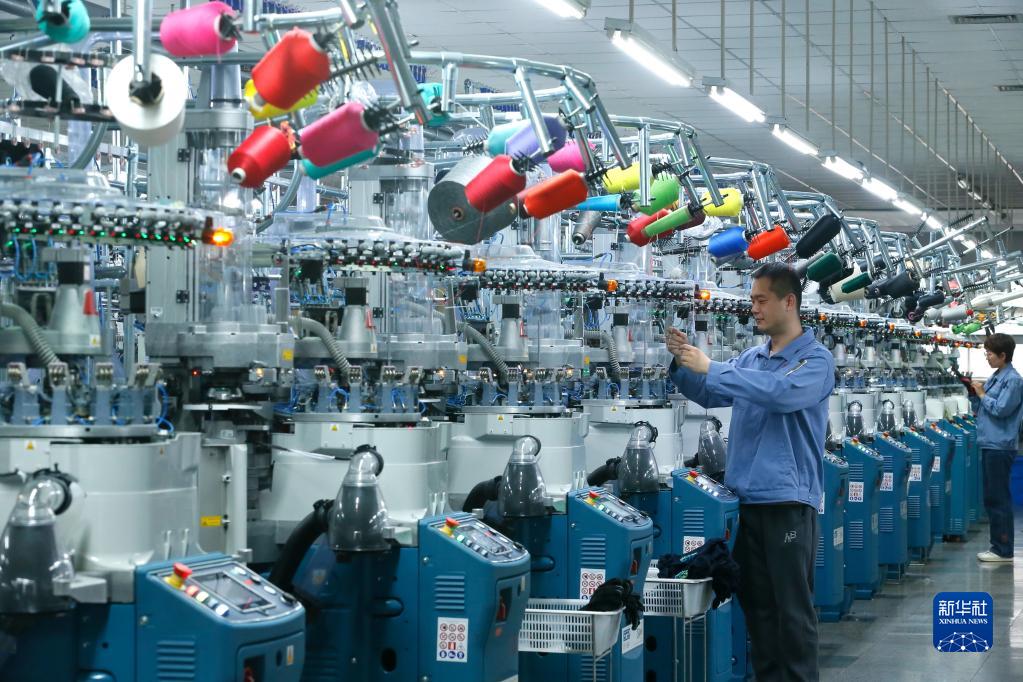 5月4日,在山东省青岛市即墨区一家制袜企业,工人生产出口到海外市场的产品。