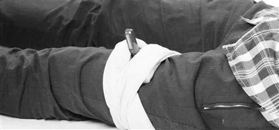 急救医生提醒,任何异物扎入人体,第一不要拔出,第二要想办法把它固定住。如果晃动体外部分,使得体内的刀尖在内部晃动,就能够切割周围的血管和神经,产生严重的后遗症。所以要固定。固定的方法,可以把三角巾中间掏一个洞,然后套在扎入人体的异物上,紧紧地捆扎起来。甚至可以用其他的敷料围绕着插入人体的异物进行旋转的包扎固定。