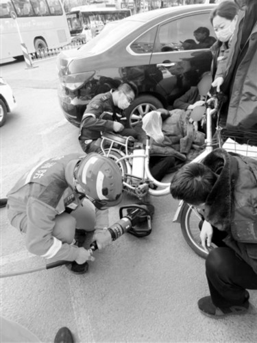 急救小组快速到达现场后迅速检查伤者伤口评估生命体征,因异物刺入深度不详,受伤情况不明,为避免发生二次损伤,薛鹏医生当即决定请119救援人员协助破拆,119救援人员赶到现场后成功破拆。