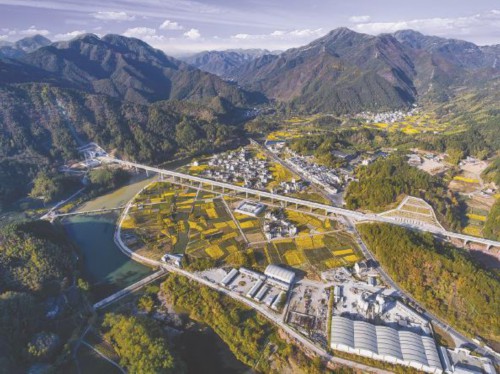 2022年11月3日,安徽省休宁县境内昌景黄高铁休宁河特大桥建设现场,工程建设与当地徽派建筑相互映衬 郎成涛 摄