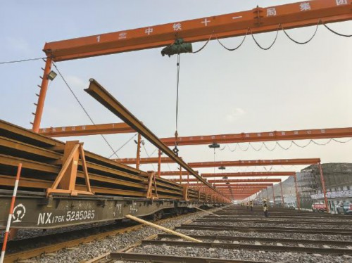 2023年6月1日,首批长钢轨运抵杭温高铁义乌铺轨基地后,工作人员正在卸车作业 黄晨阳 摄