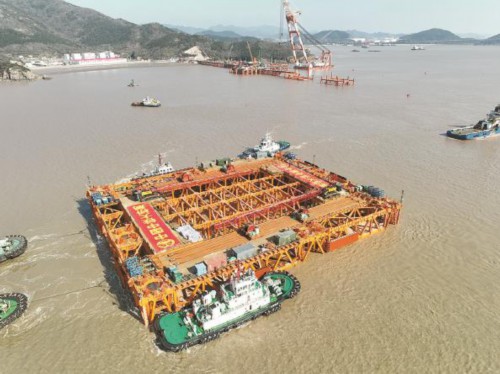 2023年2月16日,甬舟铁路西堠门公铁两用大桥5号墩自浮式钻孔平台由拖轮护送浮运 丁凯 摄
