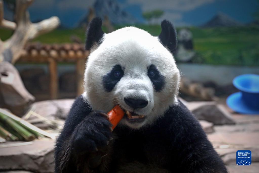 6月26日,“刚刚”在鞍山动物园熊猫馆里吃胡萝卜。