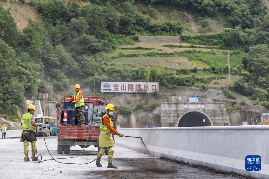 6月27日,在巫镇高速公路二标段施工现场,施工人员在进行桥面防水施工。