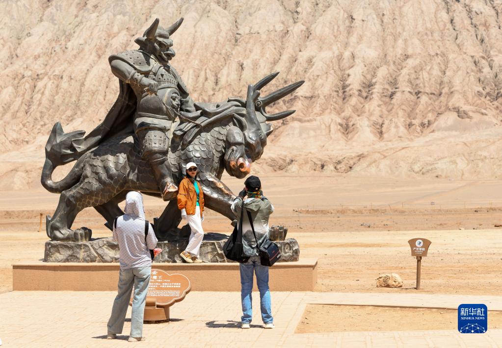 游客在位于吐鲁番市的火焰山景区留影(6月27日摄)。