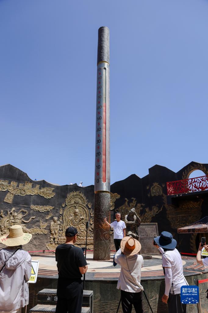 游客在位于吐鲁番市的火焰山景区拍照留念(6月27日摄)。巨型温度计显示当时火焰山景区地表温度约为65摄氏度。