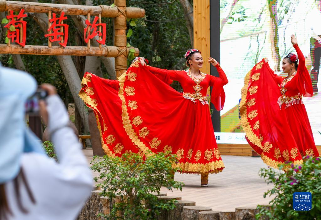 游客在位于吐鲁番市的葡萄沟景区观看歌舞演出(6月26日摄)。