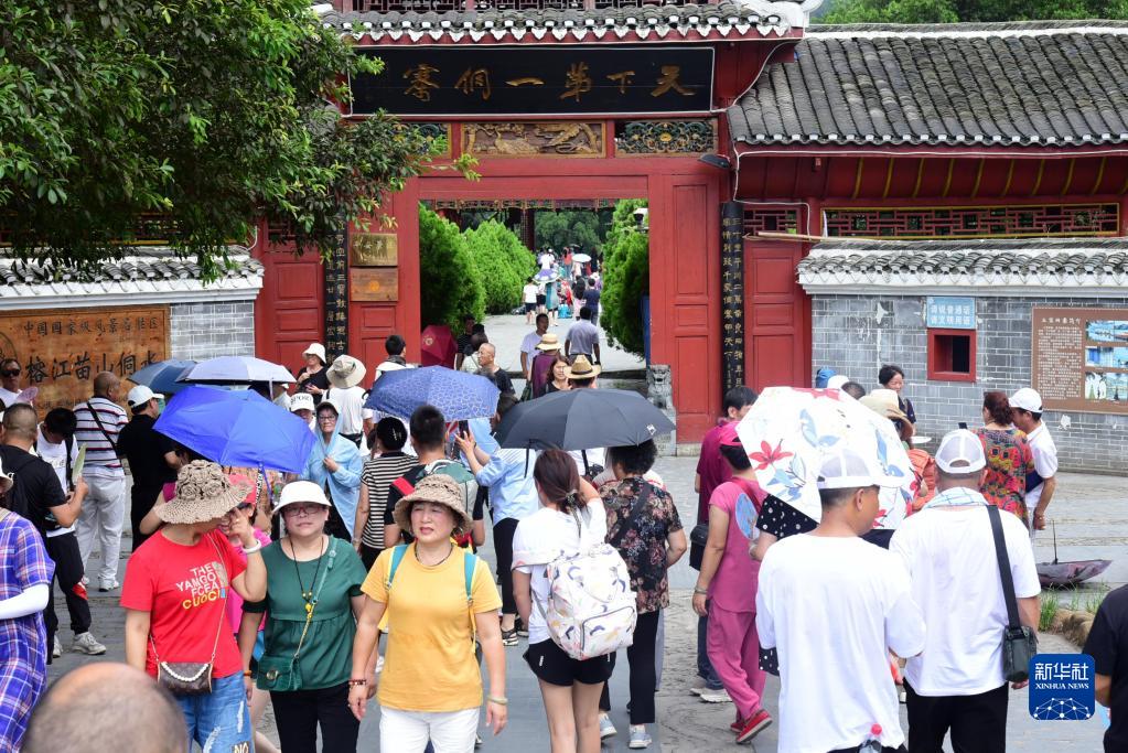 7月2日,游客在贵州省黔东南苗族侗族自治州榕江县三宝侗寨古榕群景区游玩。