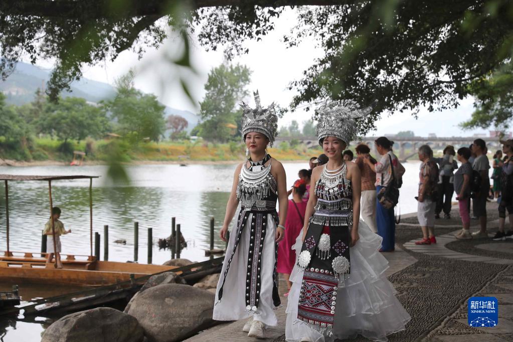 7月2日,游客在贵州省黔东南苗族侗族自治州榕江县古州镇三宝侗寨古榕群景区游玩。