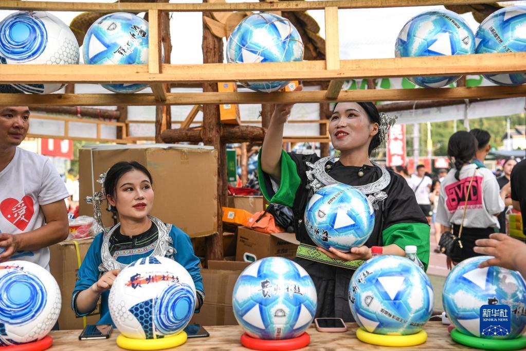 7月1日,村民在贵州“村超”足球赛场旁的文创摊位整理足球。