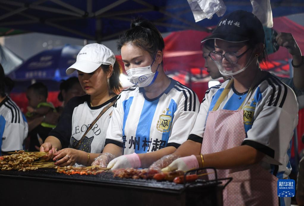 7月1日,村民在贵州“村超”足球赛场附近的摊位给游客烤肉串。