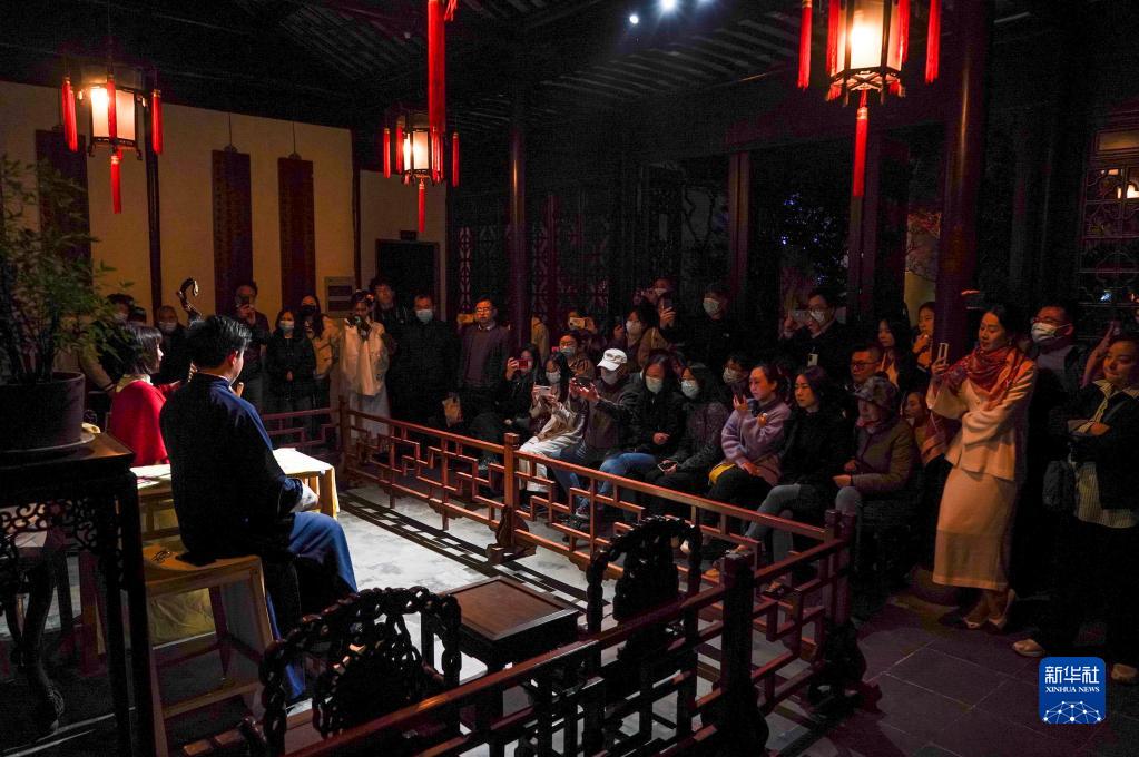 观众在苏州网师园内观看评弹表演(4月5日摄)。