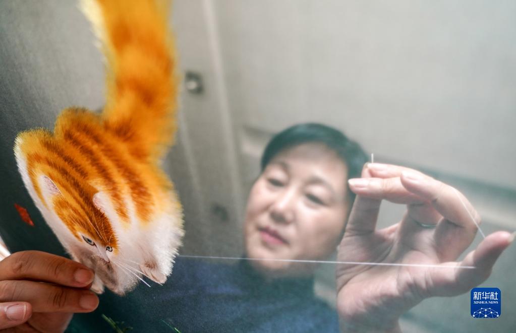 苏绣国家级非遗传承人姚惠芬在刺绣双面绣(2019年6月11日摄)。