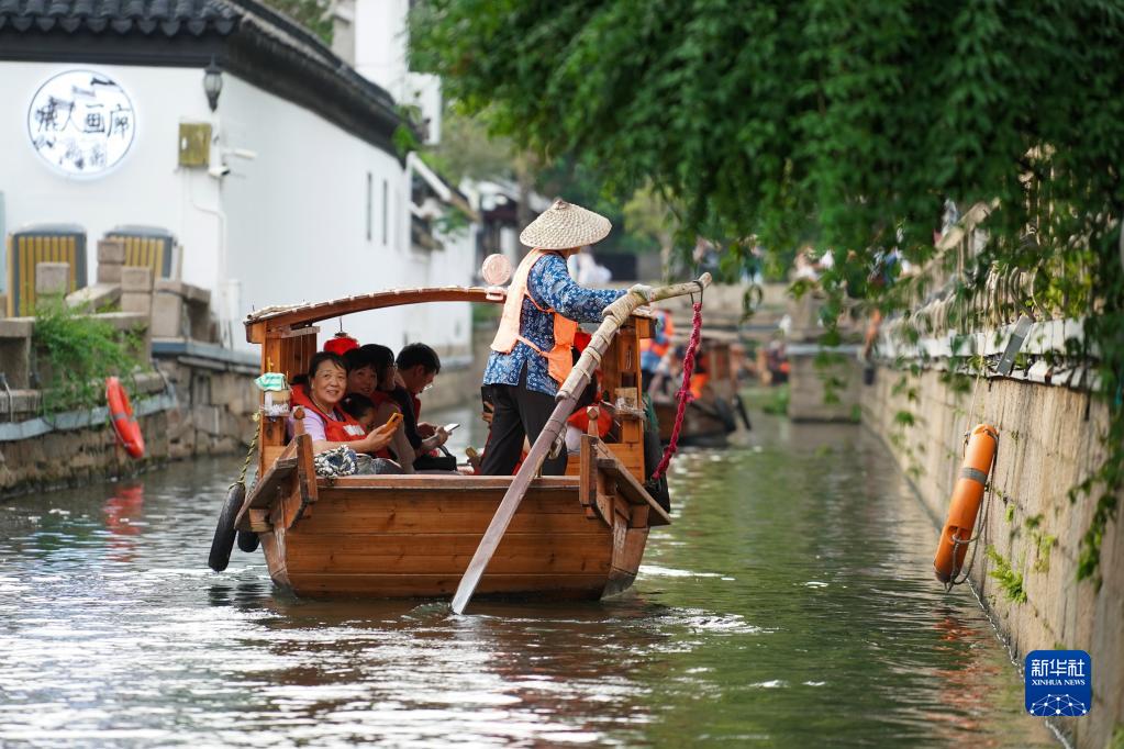 游客乘船在苏州平江历史街区休闲游玩(7月3日摄)。