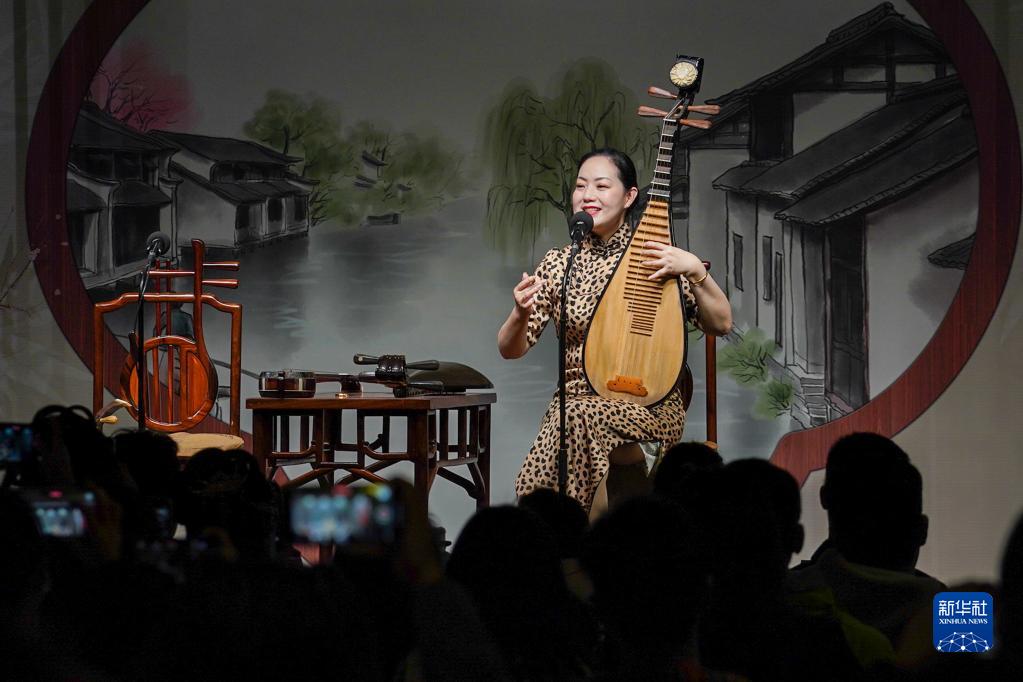 评弹演员吴亮莹在苏州市姑苏区一处评弹茶馆演唱(4月5日摄)。