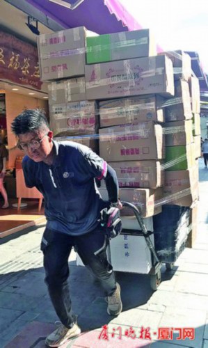 由于鼓浪屿上全面禁行机动车、非机动车,快递小哥工作时除了靠两条腿爬坡过坎,小拖车、手拉车、平板车也得用上。上岛快件也需要他们拉着小车去码头接收。