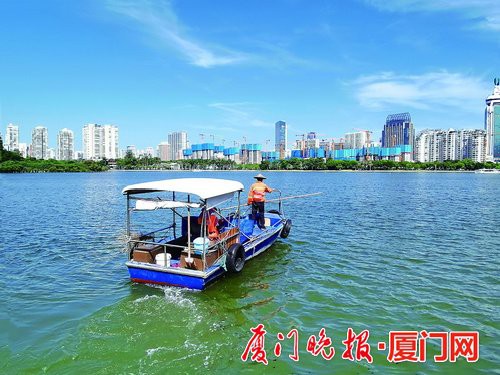 这几天下午两三点,筼筜湖水面温度达到40℃左右。湖面保洁员王忠莲和何建中上船,准备在蒸笼般的湖面上开船作业。