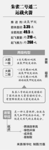 此次成功发射的朱雀二号遥二运载火箭为两级构型,以液氧甲烷为推进剂,箭体直径3.35米,全箭高度49.5米,起飞重量约219吨,起飞推力约268吨。火箭一级采用4台天鹊80吨级液氧甲烷发动机并联,二级采用1台天鹊80吨级液氧甲烷发动机和1台天鹊10吨级游动液氧甲烷发动机组合而成。