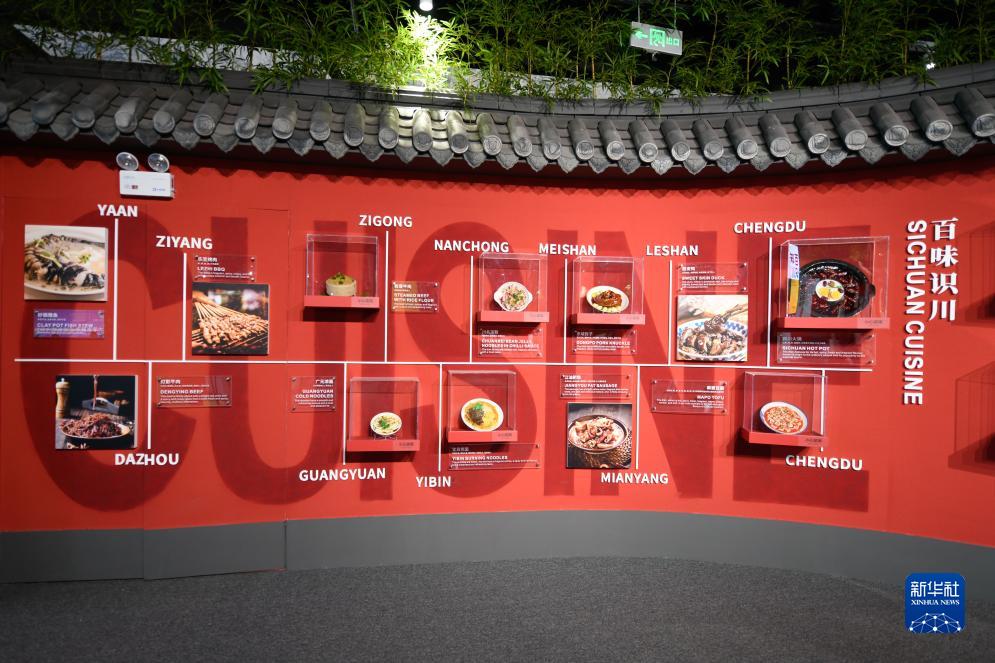 这是7月16日拍摄的大运村艺术中心内一处介绍四川美食的展示墙。