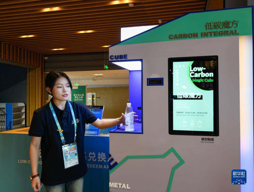 7月16日,在大运村艺术中心内,工作人员展示如何使用“低碳魔方”。将喝完的矿泉水瓶等废弃品投入“低碳魔方”可获得“碳积分”小票,可凭小票兑换相应的大运会礼品。