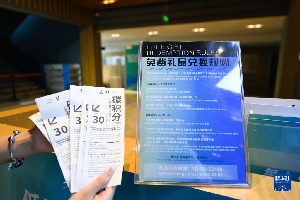 7月16日,在大运村艺术中心内,工作人员展示“低碳魔方”兑换的“碳积分”小票。