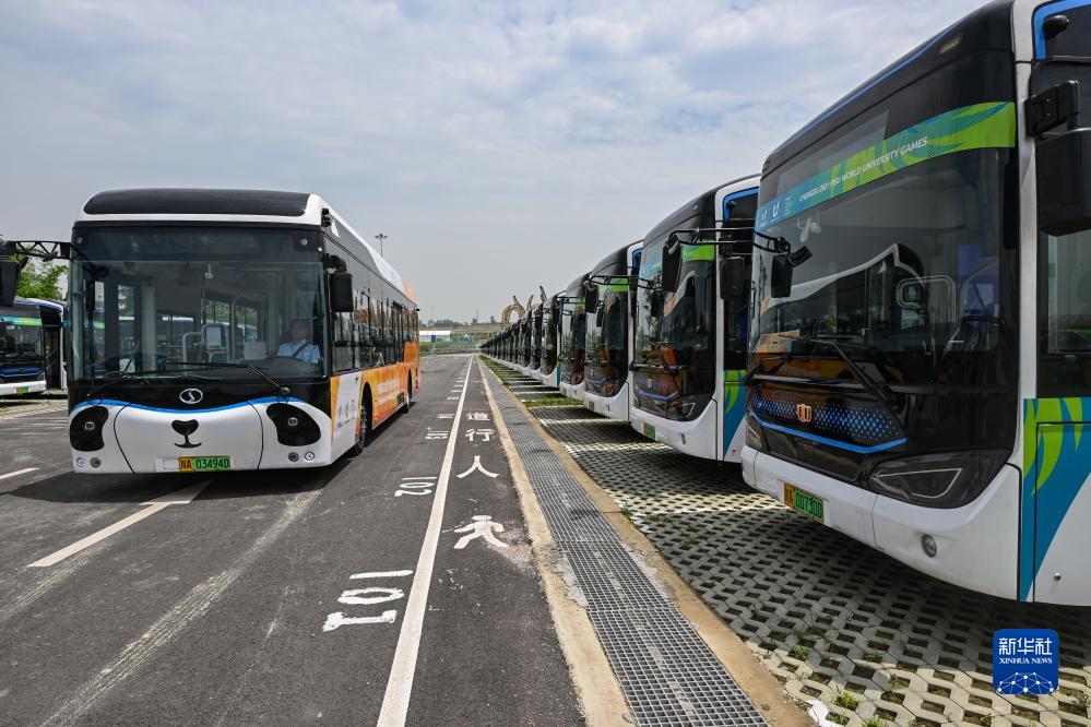 这是7月15日拍摄的负责大运会交通保障的新能源公交车。