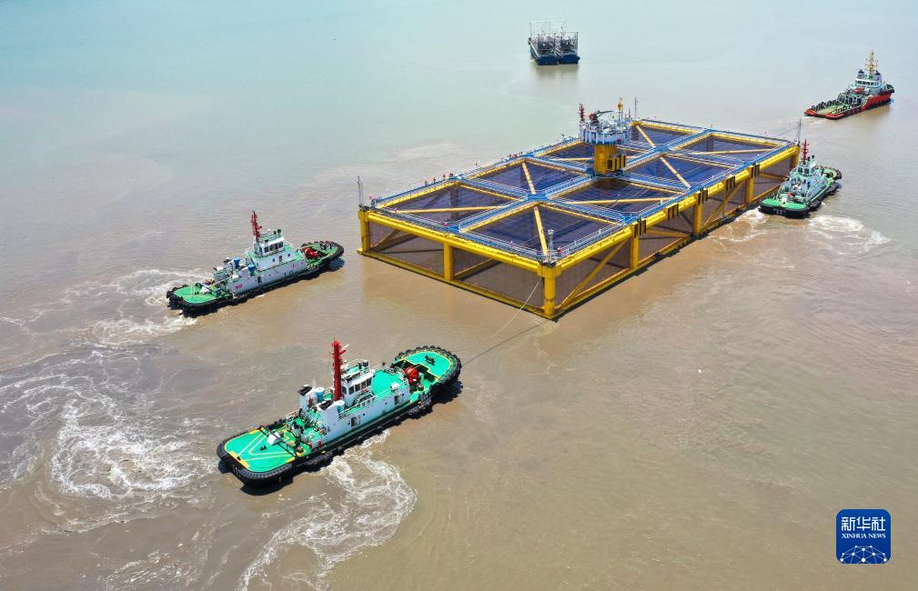 宁德制造的大黄鱼深海养殖平台“宁德1号”拖航出海,驶向霞浦北礵岛海域养殖区(无人机照片,6月27日摄)。该平台装配自动投喂、气温海水监测、信息化自动控制等先进系统,将引领宁德大黄鱼养殖由内澳走向深海。