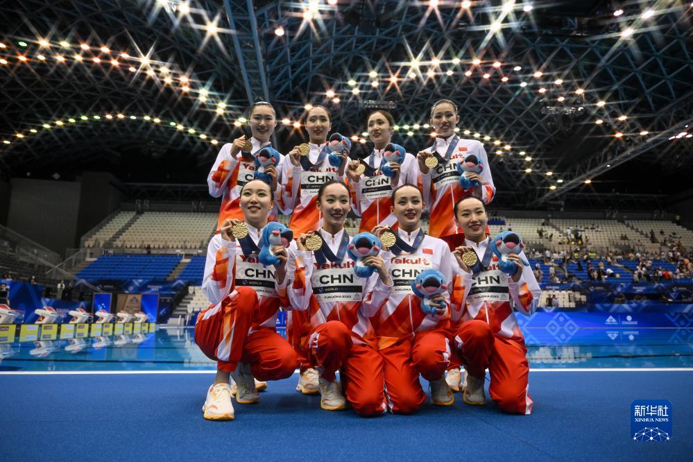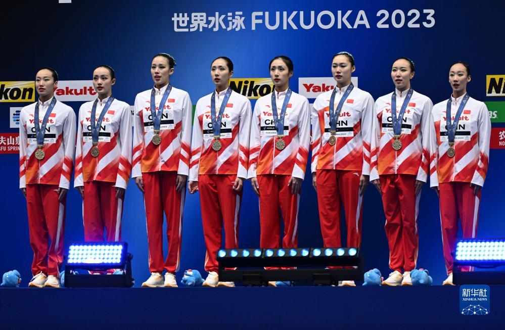 7月21日,中国队在颁奖仪式上。当日,在日本福冈举行2023年世界游泳锦标赛花样游泳集体自由自选决赛中,中国队以329.1687分的成绩获得冠军。新华社记者夏一方 摄