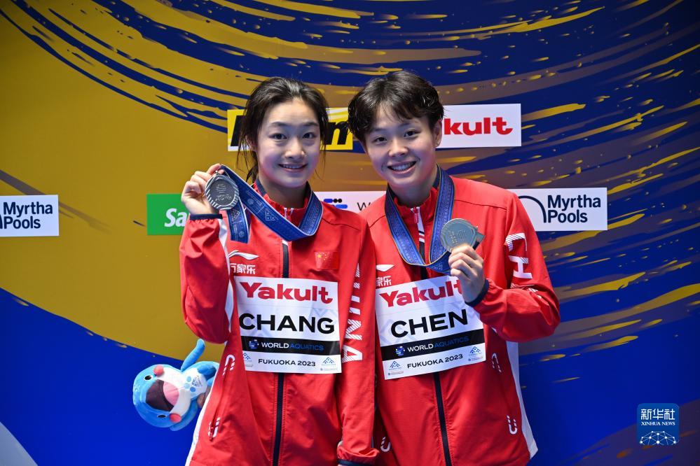 7月21日,冠军中国选手陈艺文(右)和亚军中国选手昌雅妮在颁奖仪式上。当日,在日本福冈举行的2023年世界游泳锦标赛跳水女子单人三米板决赛中,中国选手陈艺文、昌雅妮分别以359.50分和341.50分的成绩包揽冠亚军。新华社记者张笑宇 摄