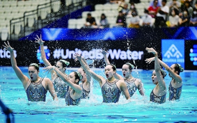 7月21日,中国队在比赛中。当日,在日本福冈举行2023年世界游泳锦标赛花样游泳集体自由自选决赛中,中国队以329.1687分的成绩获得冠军。新华社记者 夏一方 摄
