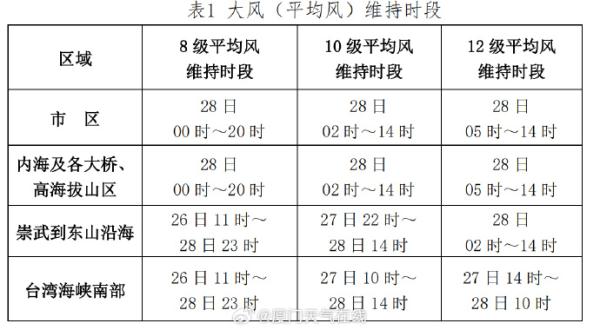 风力影响市区最大风力可达 10~12 级、阵风 13~14 级; 内海及各大桥、高海拔山区最大可达 10~13 级、阵风 14~15 级;崇武到东山沿海最大可达 13~15 级、阵风 16 级以上;台湾海峡南部最大可达 14~16 级、阵风 17 级以上。29 日白天风力逐渐减弱。