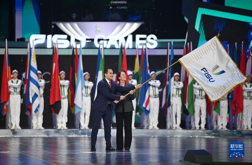 8月8日,下一届大运会主办城市代表、德国联邦内政和国土部议会国务秘书马哈茂德·厄兹德米尔(左)和国际大体联首席执委维丽娜·伯克在会旗交接仪式上。