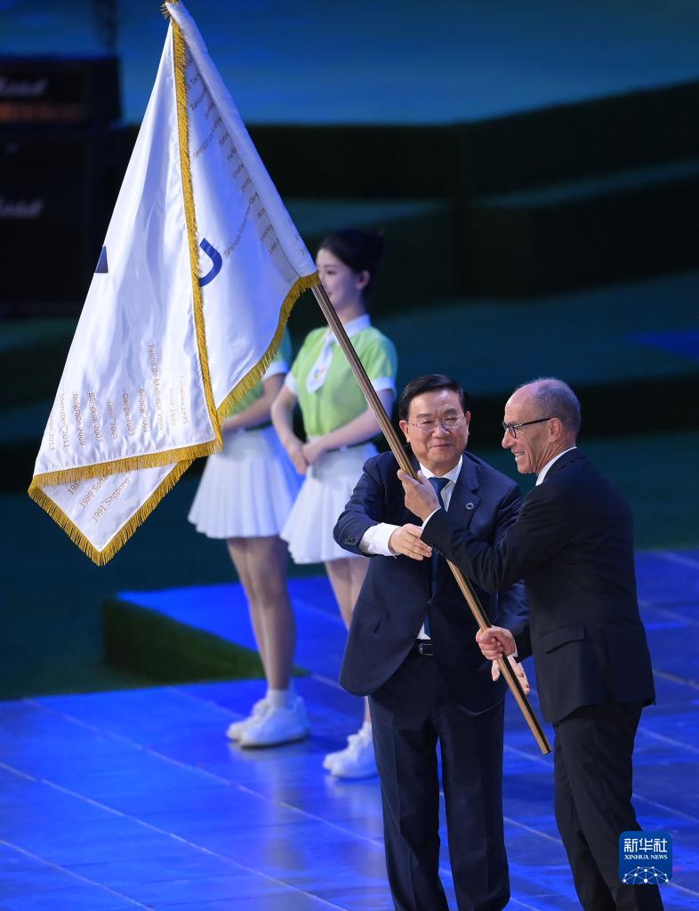 8月8日,成都第31届世界大学生夏季运动会执行委员会主席、成都市市长王凤朝(右二)与国际大体联代理主席雷诺·艾德在会旗交接仪式上。